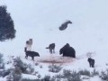 Гризли защищает свою добычу от стаи...
