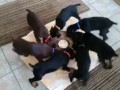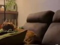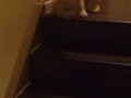 Пес учит щенка спускаться по лестни...