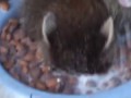 Енот пьет молоко, ныряя в миску с г...