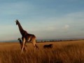 лев атакует жирафиху с детенышом