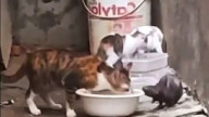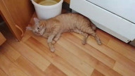 Старый кот кушает крылышко