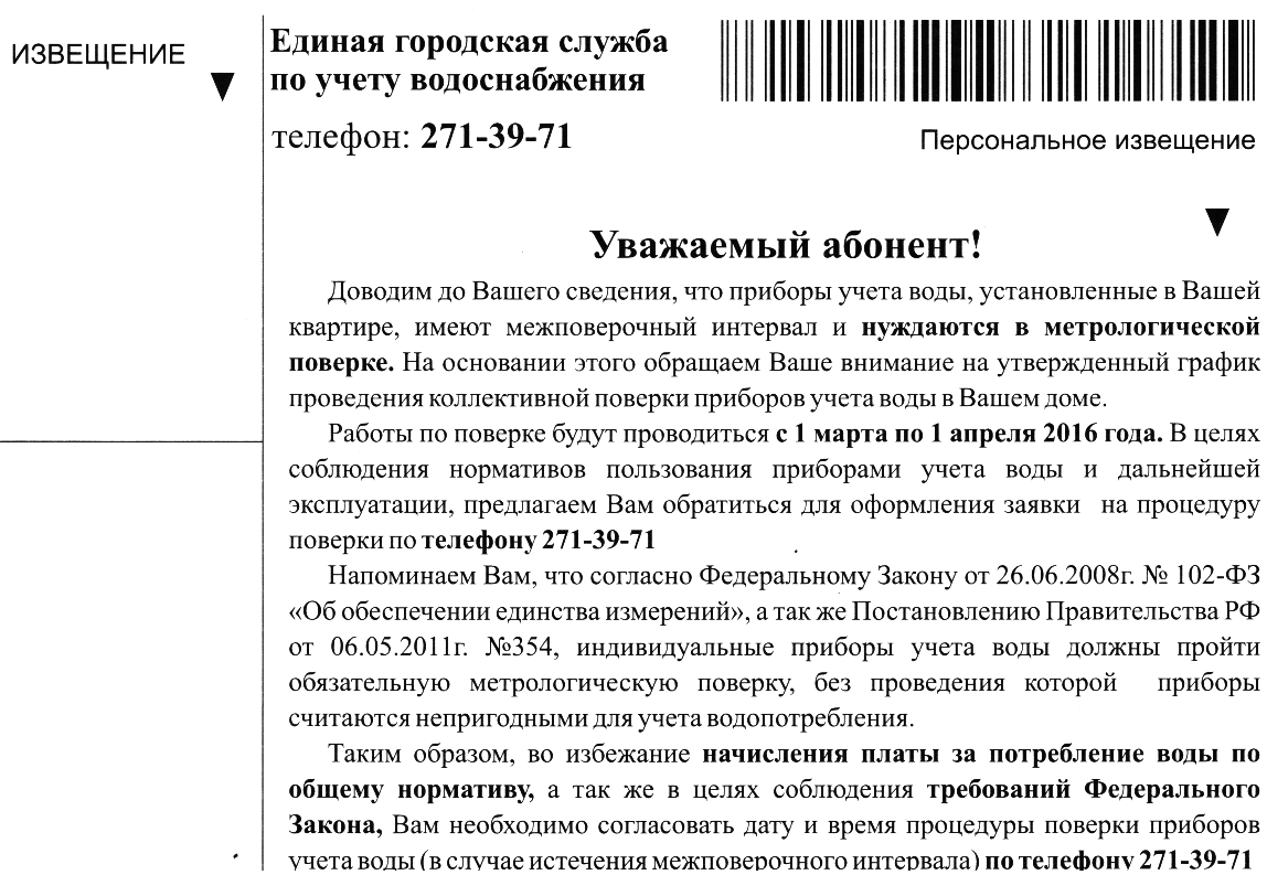 псевдоквитанция от городской службы по учету водоснаджения