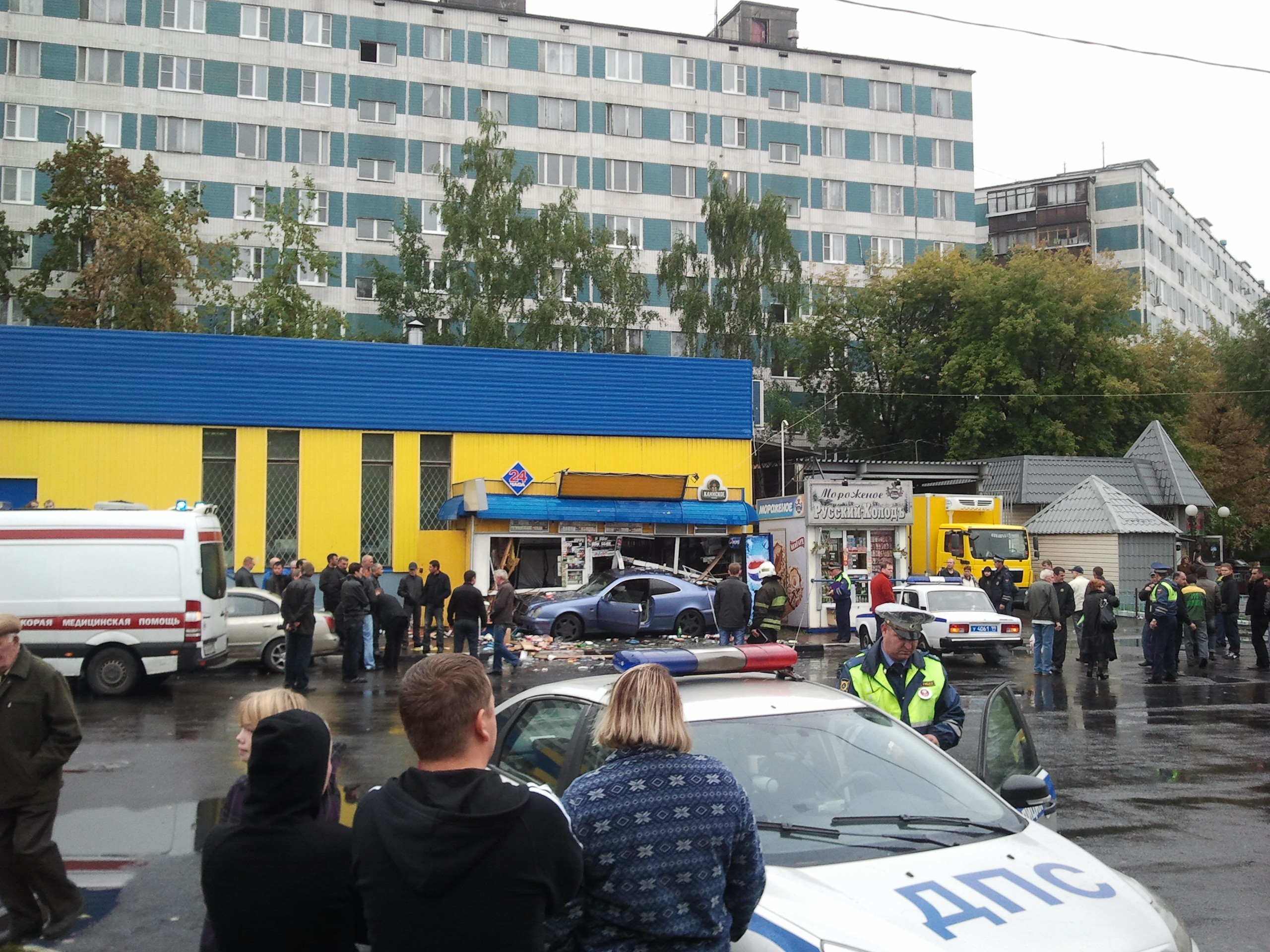 Водитель Мерседеса снёс палатку и людей, на огромной скорости (Москва, Люблино, ул.Совхозная, 11.09.2011г.). Один погиб. Двоих госпитализировали.