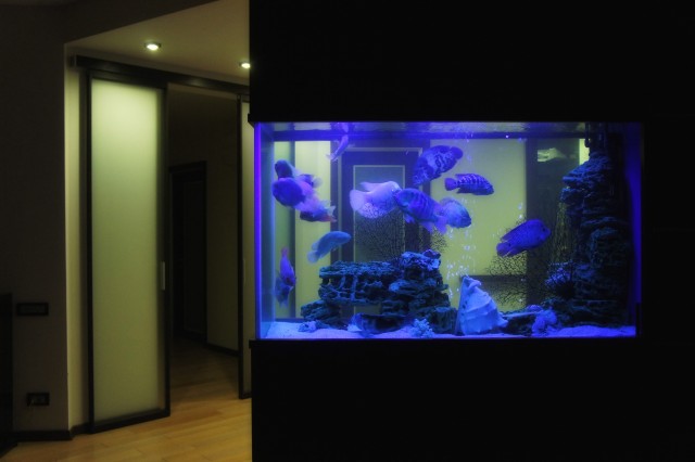 а это аква на 1200 литров, стоит на 11 этаже в центре Москвы в квартире. Стиль псевдо-море, установлена LED подсветка с пультом дистанционного управления, можно выбрать любой цвет, можно сделать что бы свет плавно сменялся, очень красиво и всегда интересно наблюдать за рыбками )